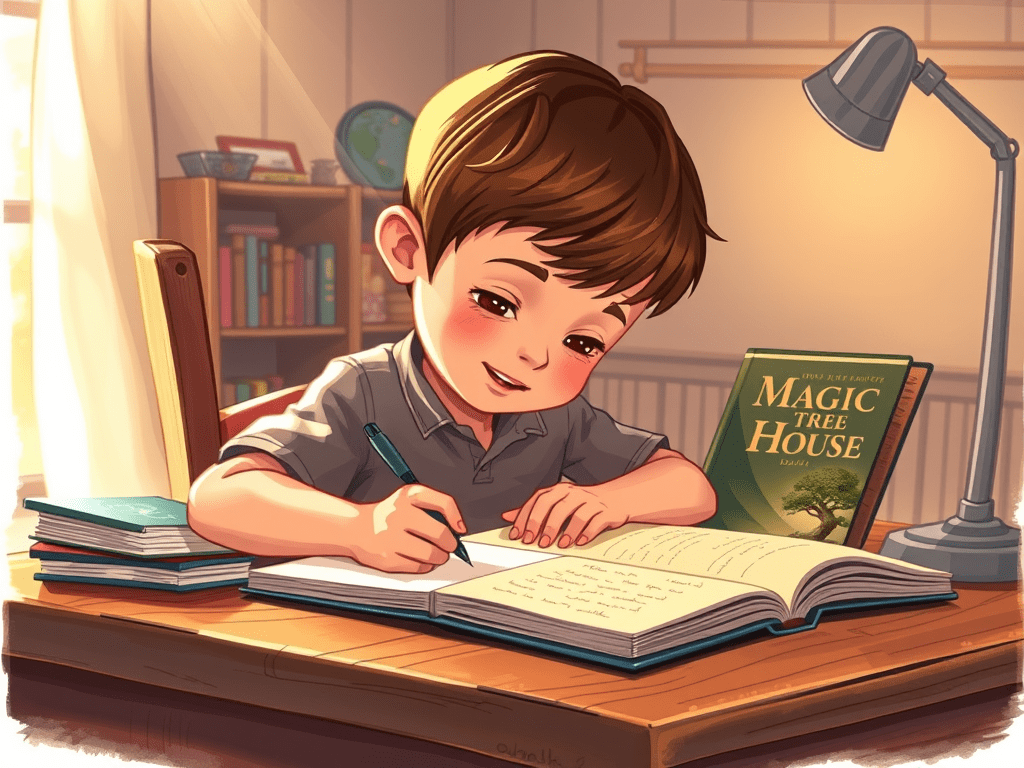 Currently, he is required to turn in 5 hand-written pages each week, with one being a book report on a book he has recently read, and the others being on subjects of his interest.